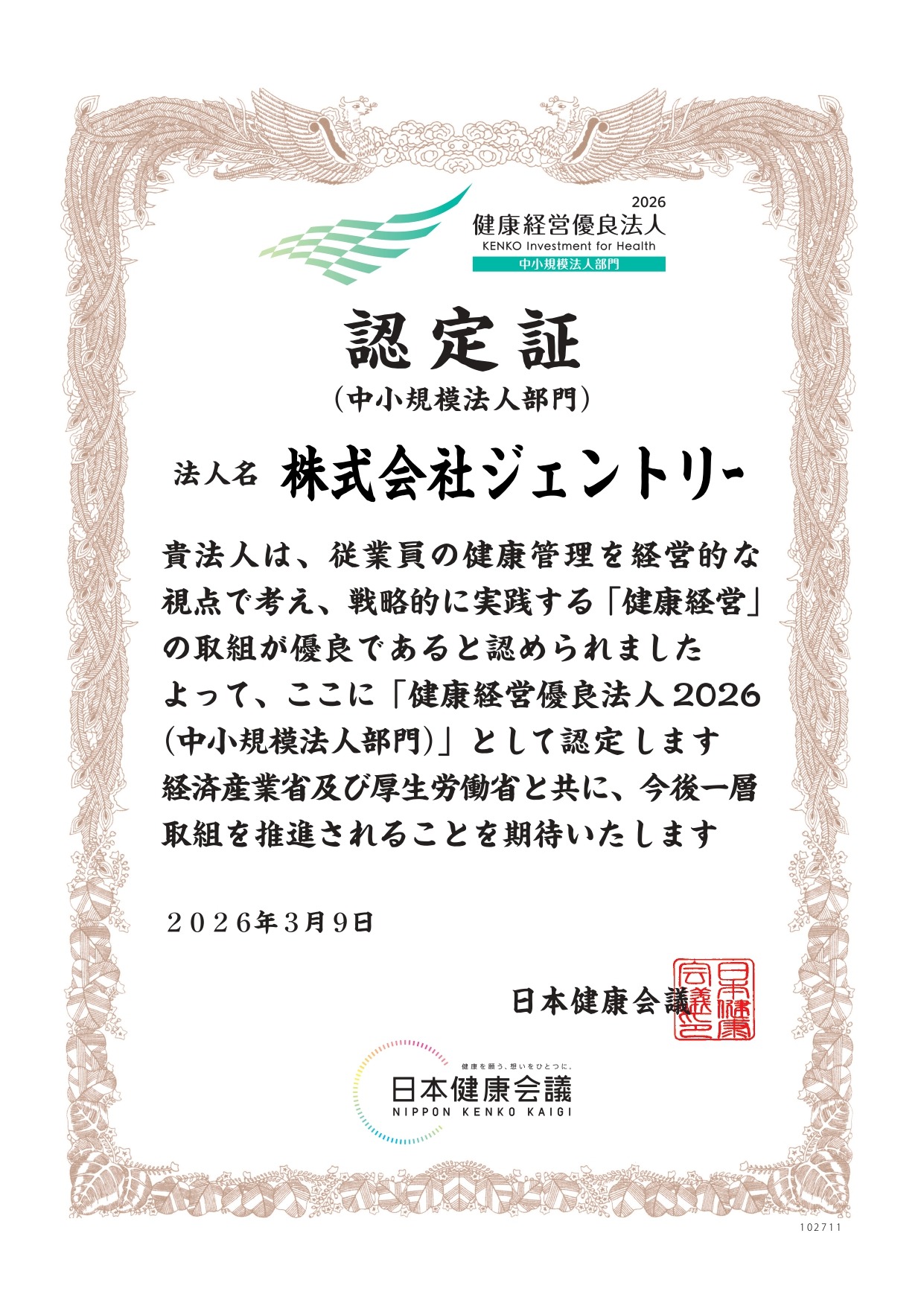 3月9日に『健康経営優良法人2026(中小規模法人部門)』の認定を受けました。